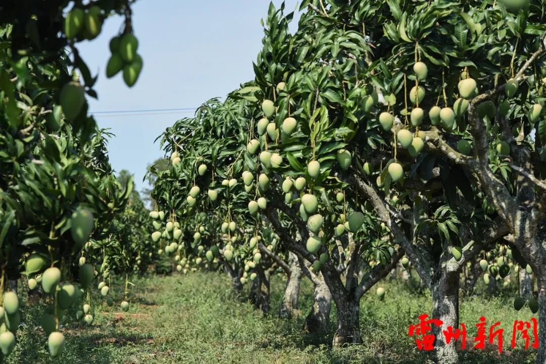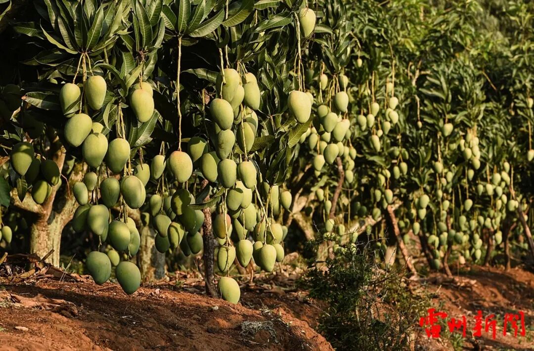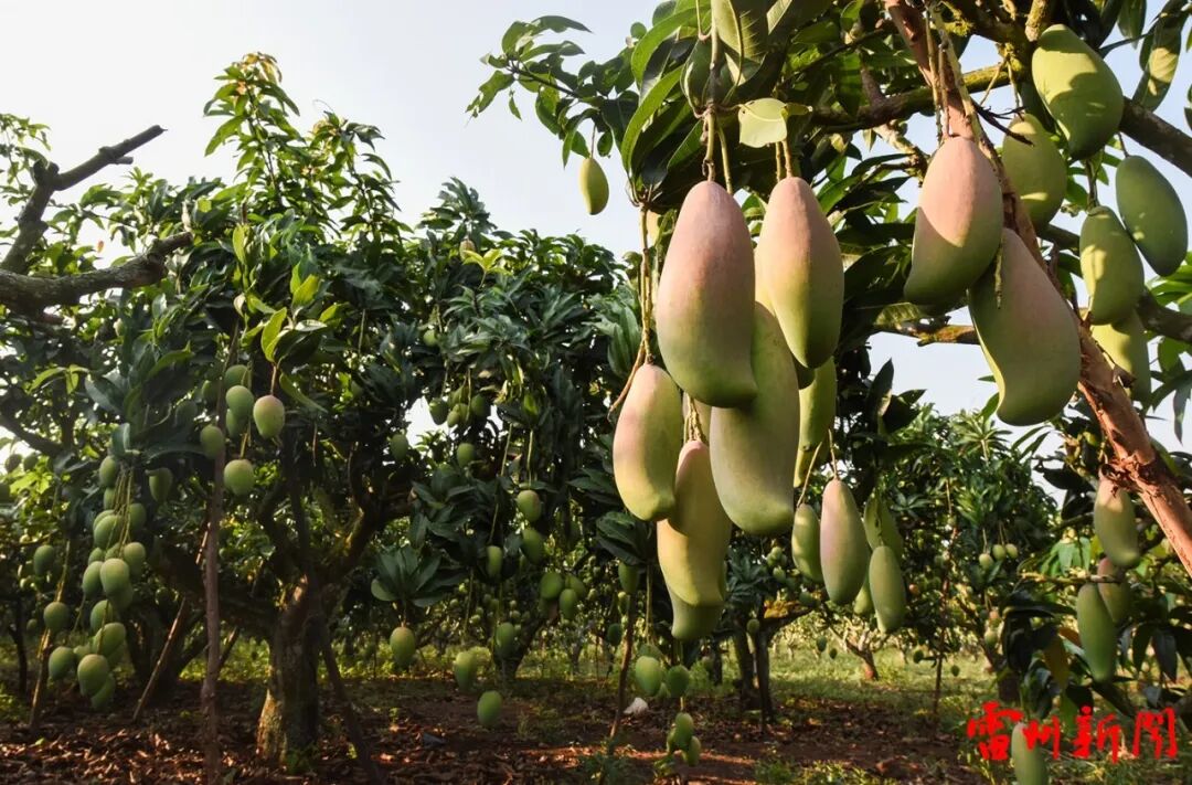 覃斗镇西岸村梁劲的果园基地,是该镇1990年成功种植的首批“蛋芒”果园,记证了这个边远滨海小镇30年芒果种植的发展史。这片果园虽是老树,几经改良换代,部分也嫁接上了“台农”、“红象芒”、“热农”等品种,一行行果树错落有致,苍老的果树却勃发苍绿,挂果累累,飘香扑鼻,令人心醉……看着累累硕果,孙正浩兴味盎然地拿起手机定格。该镇铺前村一览无余的连片2000亩生态果园,石头山地与绿叶交相辉映,光影明暗交叠,呈现出迷人与壮美的果园风光。