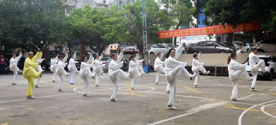 在卡卡湾开放大学操场,19位学员展示的太极拳、太极剑,一招一式,有板有眼,展现出太极拳、太极剑圆活沉稳、刚柔并济之美,尽现中华武术的魅力。